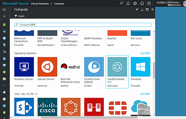 仮想マシンの構築と同様に、CentOSの仮想マシンをMicrosoft Azure上に用意してみましょう。Portal画面の左側のメニューから「新規」→「Compute」→「すべて表示」を選び、一覧から「CentOS-based7.2」を選択します(図38)。