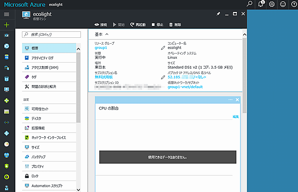 仮想マシンは実行中の状態になっているので、SSHクライアントから接続してみましょう。IPアドレスは上で控えた「パブリックIPアドレス」で、ユーザー名とパスワードは仮想マシン作成時に設定したものを使用します。