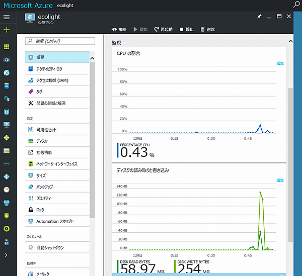 ログインできたら、CentOS側は「仮想環境でサーバー構築する」の項で実施したのと同じような手順で環境を構築します。実際に環境を構築したりMinecraftサーバーを起動したりすると仮想マシンの操作画面上に各リソースの使用状況がリアルタイムに反映されます。今後本格的に利用していく場合には課金やスケール変更などの際の目安にすると良いでしょう(図42)。