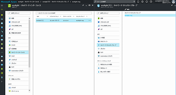 この時点ではまだMinecraftサーバーとして公開できないため、ネットワークの設定を追加していきます。仮想マシン画面の左側のメニューから「ネットワークインタフェース」を選択し、自動生成されたネットワークインタフェースを選択します。次に表示されたネットワークインタフェースの画面から更に「ネットワークセキュリティグループ」を選択します(図43)。