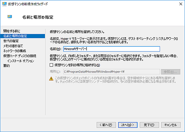 まずは「名前」を決めます。適当な分かりやすい名前で大丈夫です。ここでは「Minecraftサーバー」としました。デフォルトではシステムディスク上のProgramData配下に保存されますが、容量の都合で他の場所が良ければ「仮想マシンを別の場所に格納する」にチェックを入れ、任意の場所を選択しましょう(図8)。