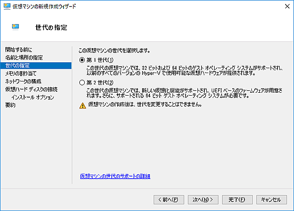 次に仮想マシンの世代を選択します(図9)。世代はインストールするゲストOSによって異なりますが、今回はCentOS 7.x系をインストールする予定なのでどちらでも構いません。なお、画面の下方にある「仮想マシンの世代のサポートの詳細」をクリックすると対応する世代や動作の詳細な説明を参照できます。ここでは第1世代を選択します。
