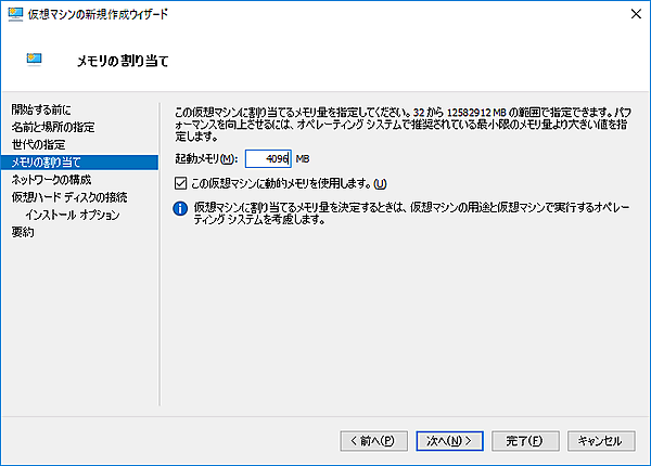 次に割り当てメモリを指定します。ゲストOSの推奨メモリサイズ+Minecraftサーバーで使用するメモリサイズを指定しましょう。ここでは4GB(4096MB)指定しました。「この仮想マシンに動的メモリを使用します。」にチェックを付けておくと、メモリが不足した場合に動的にメモリを確保するようになります。物理メモリのサイズに不安がある場合はチェックを付けておくと良いでしょう(図10)。