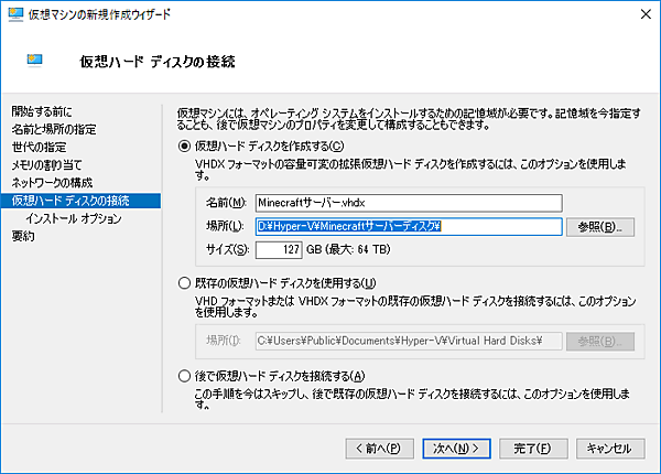 次に仮想ハードディスクを作成します。名前や場所は任意ですが、これもゲストOSが使用する最低サイズやMinecraftサーバーで使用するサイズを見積もっておきましょう。ここでは容量に余裕のある物理HDD上に127GBを確保するようにしました(図12)。