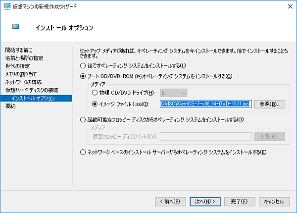 ダウンロードが完了したら「仮想マシンの新規作成ウィザード」に戻り、ダウンロードしたDVD ISOイメージファイルを指定して「次へ」をクリックしましょう(図15)。