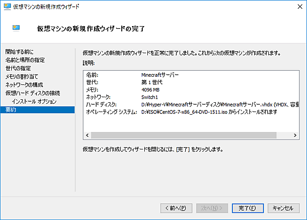 最後に新規作成する仮想マシンの説明が表示されるので、確認して「完了」ボタンをクリックすると仮想マシンが作成されます(図16)。