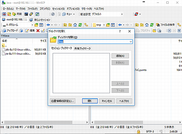 接続できたら/tmpに移動して、ダウンロードしたJDKファイルを左側のペインから右側のペインにドラッグ&ドロップします(図32)。