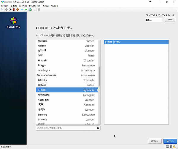 CentOSのインストールウィザードが起動したら、インストール時に使用する言語から「日本語」を選択し「続行」ボタンをクリックします(図20)。