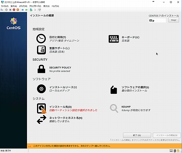 ここからはCentOSをインストールし、JavaおよびSpigotサーバーを構築していきます。本来であればCentOSの設定はいろいろなセキュリティ対策を勘案しながら行う必要がありますが、とりあえずここでは「Spigotサーバーを動作させること」を目的に手短に実施していきます。