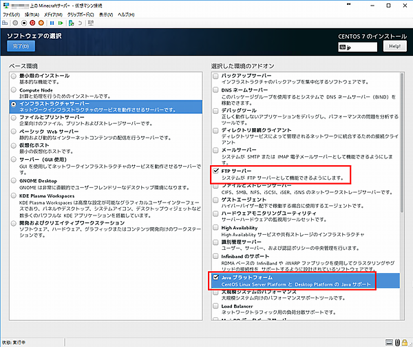 「ソフトウェアの選択」画面では「ベース環境」の一覧から「インフラストラクチャサーバー」を、「選択した環境のアドオン」の一覧から「FTPサーバー」と「Javaプラットフォーム」にチェックを入れて「完了」をクリックします(図22)。