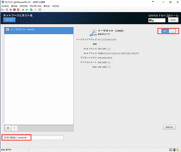 先ほど仮想スイッチを「外部」に設定したので、現在使用しているマシンがルーターなどに接続されている場合は自動的にローカルIPアドレスが割り当てられて表示されます。「ホスト名」には適当に分かりやすい名前を付けておきます。設定を終えたら「完了」ボタンで戻りましょう(図24)。