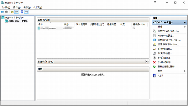 BIOSメニューにおける項目名はメーカーによりさまざまですが、大抵はCPU系の設定画面に項目があります。ここで「仮想化テクノロジ」「ハードウェアによるデータ実行防止」の各項目を有効化する必要があり、Intel系では「Intel Virtualization Technology」や「Execute Disable Bit」などの文言になっていると思います。無事にHyper-Vを有効化できたら、スタートメニューなどからHyper-Vマネージャーを起動しましょう(図4)。