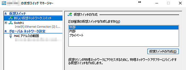 仮想スイッチマネージャーが開いたら「新しい仮想ネットワークスイッチ」を選択し、「仮想スイッチの作成」で「外部」を選択して「仮想スイッチの作成」ボタンをクリックします(図6)。プロパティの設定画面が表示されるので、任意の名前を付けて「OK」ボタンを押して完了しましょう。