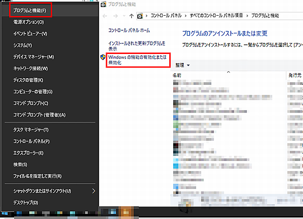 まずは、Hyper-Vを有効にする必要があります。「プログラムと機能」から「Windowsの機能の有効化または無効化」を参照しましょう。「プログラムと機能」はタスクバーのスタートメニュー(Windowsアイコン)を右クリックすると簡単に開けます(図2)。