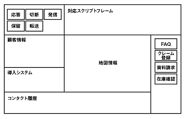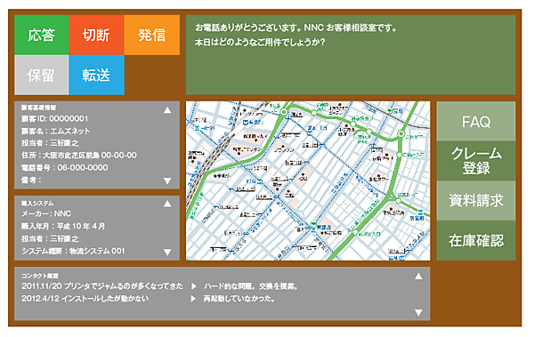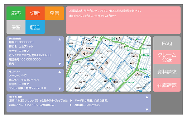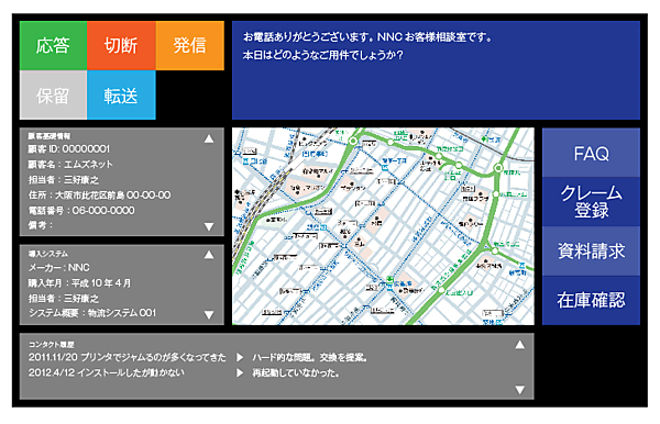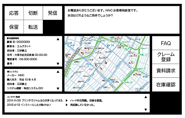 画面中央には地図情報を配置し、その左側に顧客情報と現在利用しているシステムの情報を、右側には別のアプリケーションを起動するボタンを配置しています。問合せ内容に応じて立ち上げるボタンですね。一番下には、その顧客との過去のコンタクト履歴を一覧できるようにしています。