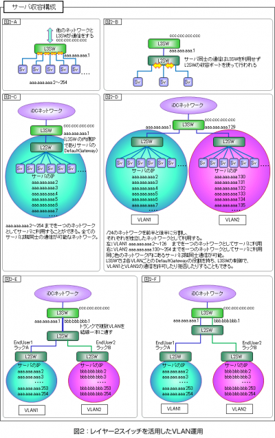図2-Cは、割り振られたIPアドレス空間を単一のネットワーク・セグメント(ブロードキャスト・ドメイン)として運用している例です。一方、図2-Dは、iDCから取得したネットワークを、VLANを用いてVLAN1とVLAN2という異なる2つのネットワークに切り分けた例です。