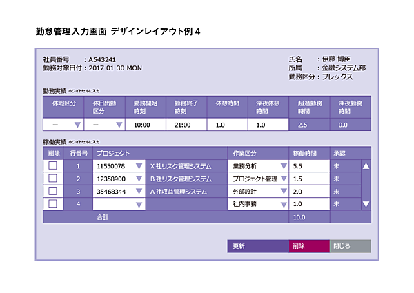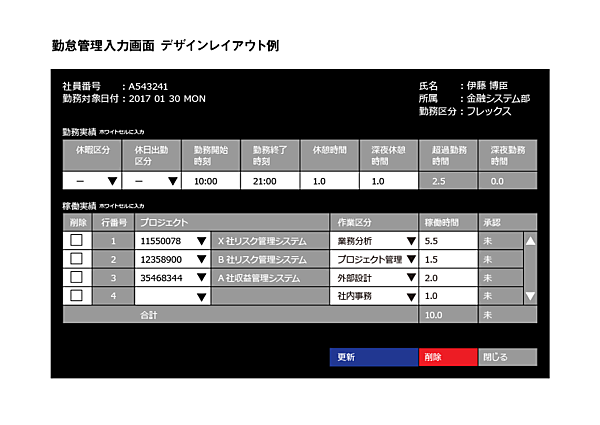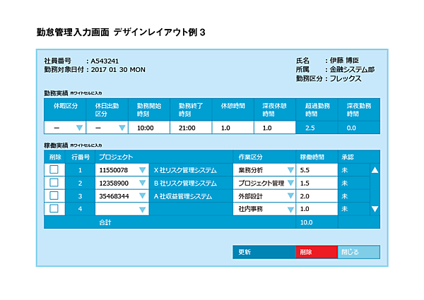 ブルーを基調に、大きな面でブラックを使わない配色にしてみました。第1案、第2案とはまったく違う世界感になりますね。勤怠管理画面としてはちょっと明るいかな(笑)。でも、若い人が多く“明るいイメージ”の会社だったら、こっちの方が良いかもしれません。