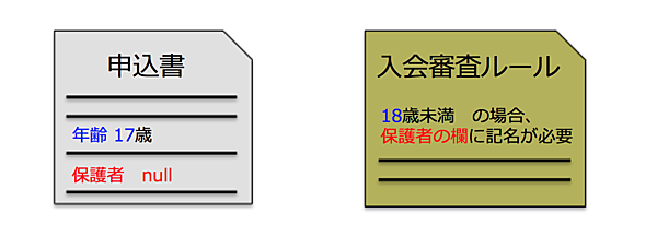 これは、申込書というオブジェクトの中にある、“年齢”というオブジェクトと、18という数値(固定的なオブジェクト)を比較しています。