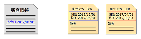 これは、顧客情報というオブジェクトにある顧客の“入会日”というオブジェクト(日付データ)とキャンペーン情報というオブジェクトの中にある“キャンペーン期間”というオブジェクト(日付のレンジや入会日から何日以内などという数値)を比較しています。