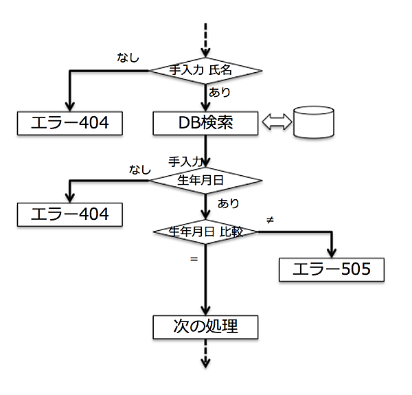 これをシステム側ではロジックの中で、「氏名がある場合はデータベースの検索を行い、ない場合はエラーコード404を返す。次にデータベースを検索し氏名が一致するレコードを取り出す。入力された生年月日と検索結果の生年月日を比較し、一致していなかったらエラーコード505を返す、入力された生年月日がない場合はエラーコード404を返す」というようなことをしていたかと思います。これを一連で書くと、まさに手続き型のフロー図になります。