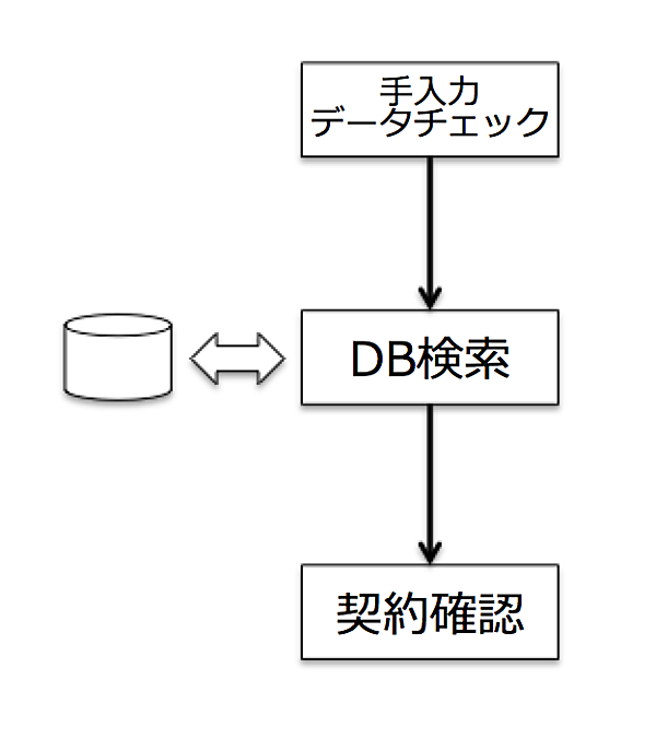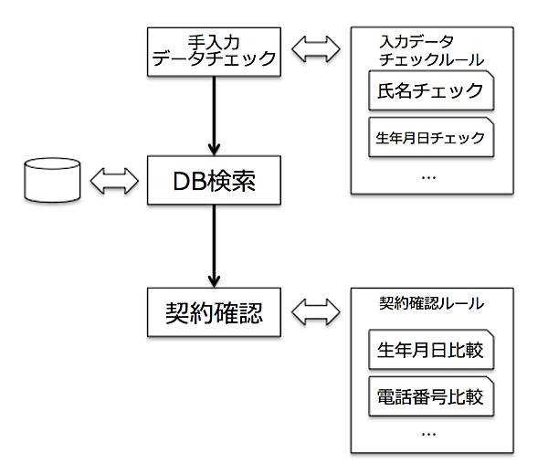 例として、Webで受付をしたデータで契約確認をするロジックを考えてみます。業務側がやりたいことは、「本人確認には、登録された生年月日と電話番号を確認すること」です。