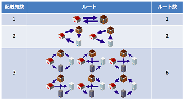 この巡回セールスマン問題の難しさは、巡回すべき場所(配送業者であれば配送先)が増えれば増えるほど、配送ルートの数が爆発的に増加し、どのルートが最も効率的かを総当りで検証することが現実的ではなくなる(NP困難)と言う点にあります。