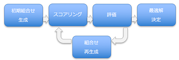 | Simulated Annealing | 局所的な最適解探索に陥るのを防ぐために、スコア劣化となる組合せであっても確率的に評価対象として探索を行う方法 |