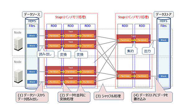Sparkが最初にHDFSからデータを読み込んだ時(図1(1))のパーティション数はファイルのブロック数と同じですが、DataFrame APIを使用してシャッフル処理(図1(3))すると、パーティション数が200個(デフォルト値)に変更されます。デフォルト設定では1パーティションを1コア(で動作する1タスク)が処理するため、最低でもコア数以上のパーティションがないと最適な設定とは言えません。またシャッフル処理後の適切なパーティション数は処理に依存します。