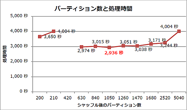 - パーティション数が1,050個のとき、処理時間は最短で2,936秒であった