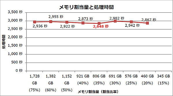 最短の処理時間は2,848秒で、1,728GB(デフォルト設定)のときの2,936秒から約3%の高速化を達成しました。平均処理時間は2,915.6秒、標準偏差は47.6なので性能向上していると言えます。