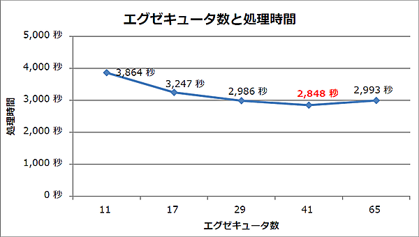 - エグゼキュータ数が41個(初期設定)の場合に処理時間が最短(2,848秒)であった