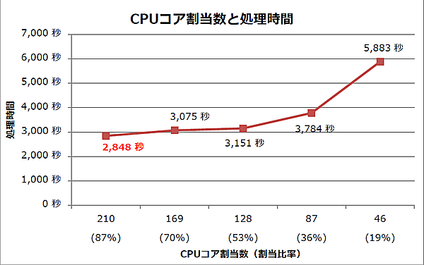 - Sparkへの割当コア数が210個(初期設定)のとき、処理時間が最短(2,848秒)であった