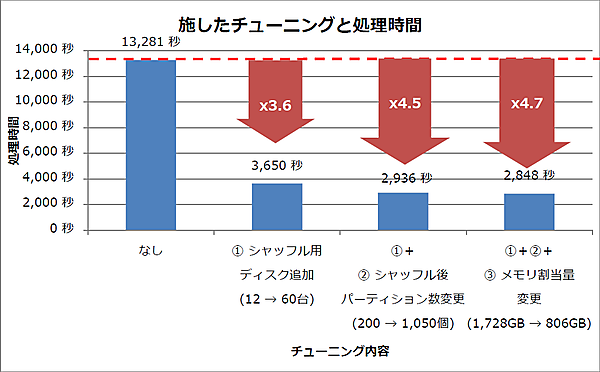 例えば、ページキャッシュにシャッフルファイルが収まらないとき、シャッフルファイル出力先をHDFSが使うディスクと共用する形で追加することで約3.6倍の性能向上を実現しました。ただしこの方法はHDFSのディスクアクセス性能を低下させるため、シャッフルファイルがページキャッシュに収まる場合は処理性能が若干低下します。またパーティション数のように実際に試してみないと最適値が分からないパラメータもあります。