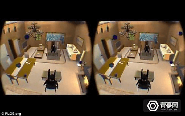 バルセロナ大学のメル・スレーター氏が率いる研究チームは、32名の患者にOculus Riftを使用しました。シミュレータを起動すると、自分と全く同じ体型であるバーチャルボディーが視界に入ります。のちにバーチャルボディーと使用者の動作は完全に一致させ、もしVRでボールを体に投げると、使用者が足に装着した部品も同じように振動します。使用者とバーチャルボディーが合致したあと、彼らをバーチャル・リビングルームに入らせ、遠くから投げられるボールを両足で蹴ると、その後、使用者の目線はバーチャルボディーの後上方に移り、自分の体を俯瞰できるようになります。