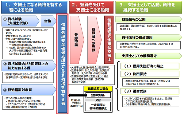 (過去の「テクニカルエンジニア(情報セキュリティ)試験」合格者、「情報セキュリティスペシャリスト試験」合格者も経過措置対象者として含む) - 「情報処理安全確保支援士試験」に合格後、IPAが管理する登録簿に登録すること