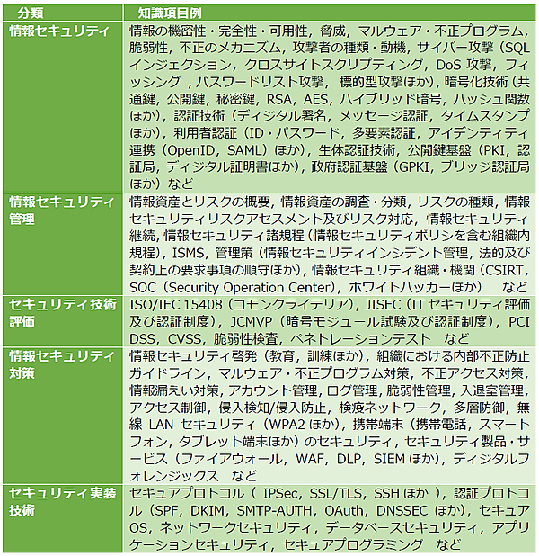 表6:セキュリティの知識項目例(IPA 「試験要綱Ver3.0」から引用)