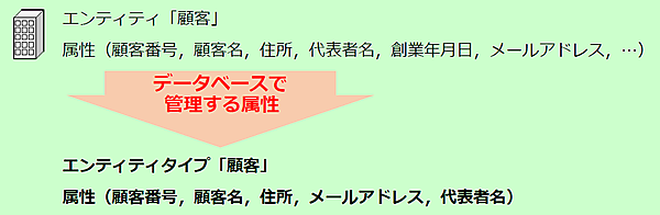 実体(エンティティ)に含まれるデータ項目(属性)のうち、データベースで管理する必要があるものを抽出した結果です。例えば、実体「顧客」が持つ属性に「顧客番号」「顧客名」「住所」「代表者名」「創業年月日」「メールアドレス」があったとしても、システムで管理すべき属性が「顧客番号」「顧客名」「住所」「メールアドレス」「代表者名」のとき、エンティティタイプ「顧客」の属性は「顧客番号」「顧客名」「住所」「メールアドレス」「代表者名」となります(図1)。