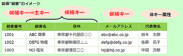関係に含まれる1件のデータを識別するための属性または属性の集まり(複合キー)のことで、関係には1つ以上の候補キーがあります。例えば、関係「顧客」において1件の社員データを識別するための属性として「顧客番号」と「顧客名」+「住所」の組み合わせ、および「メールアドレス」が存在した場合、「顧客番号」と「{顧客名,住所}」、および「メールアドレス」が候補キーです。