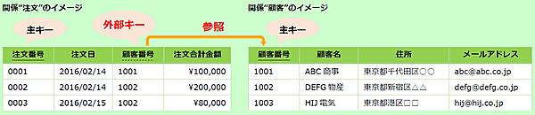 主キーと関連づけて定義し、主キーと一致する値のみ保持できるようにした属性または属性の組み合わせのことです。例えば、関係「顧客」の主キーが「顧客番号」で、関係「注文」において関係「顧客」と関連を持たせたい場合、関係「注文」に外部キー「顧客番号」を定義し、関係「顧客」の主キー「顧客番号」との関連を定義します(図3)。なお、外部キーの属性には点線の下線を追加する場合があります。