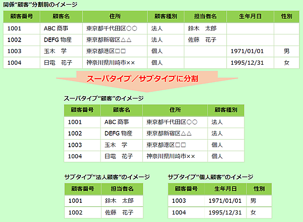 顧客には法人顧客と個人顧客があり、法人顧客と個人顧客の両方に共通の属性として「顧客番号」「顧客名」「住所」「顧客種別」があったとします。一方、法人顧客のみ存在する属性に「担当者名」が、個人顧客のみ存在する属性に「生年月日」「性別」があったとします。このような場合、法人顧客と個人顧客に共通の属性をスーパタイプ「顧客」に持たせ、法人顧客にのみ存在する属性をサブタイプ「法人顧客」、個人顧客にのみ存在する属性をサブタイプ「個人顧客」に持たせます。スーパタイプ「顧客」とサブタイプ「法人顧客」「個人顧客」の主キーは全て「顧客番号」とします。そして、サブタイプの主キーはスーパタイプの外部キーとなります(図4)。