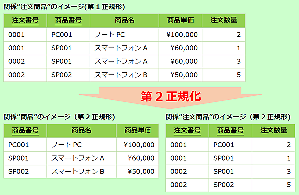 第1正規形に対して部分関数従属性(複合キーの一部の属性だけに関数従属する属性が存在する属性間の関係)を排除し、全ての非キー属性が完全関数従属した関係のことです。例えば、関係「注文商品」に含まれる属性「商品名」と「商品単価」が、主キー{受注番号,商品番号}の一部である属性「商品番号」に部分関数従属しているとします。このとき、第2正規化を実施して属性「商品番号」を主キーとする関係「商品」に分離します。これにより関係「商品」と「注文商品」は完全関数従属した状態となり、第2正規形となります(図6)。