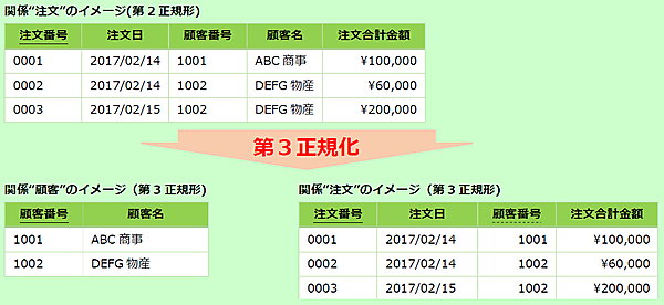 第2正規形に対して候補キーを起点とした推移的関数従属性(属性A→属性B→属性Cが成立する属性間の関係)を排除した関係のことです。例えば、関係「注文」に含まれる属性「顧客名」が非キー属性「顧客番号」に関数従属している場合、関係「注文」には「注文番号→顧客番号→顧客名」という推移的関数従属性が存在することになります。そこで第3正規化を実施し、属性「顧客番号」を主キーとする関係「顧客」に分離します。これで関係「顧客」と「注文」には推移的関数従属性がなくなり、第3正規形となります(図7)。