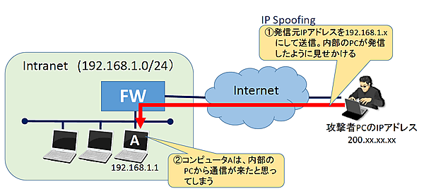 例えば、外部(Internet)の攻撃者が発信元IPアドレスを内部(Intranet)のアドレスに偽装してIP Spoofing攻撃を行った場合、攻撃を受けたコンピュータAは発信元IPアドレスが内部のIPアドレスのため、内部のコンピュータからアクセスされたと思い、特に拒否することなく外部からの通信を許してしまいます。この場合の対策は、外部と内部の境界であるファイアウォールが「通常、内部のアドレスが発信元IPアドレスにセットされて、外部から内部へ通信されることはない」ことに気づく必要があります。