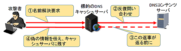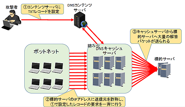 設問2の空欄cの解答は「DNSリフレクション攻撃」です。これはDNSリプライを使用して標的サーバに大量の回答パケットを送りつけるDoS攻撃です(図2)。