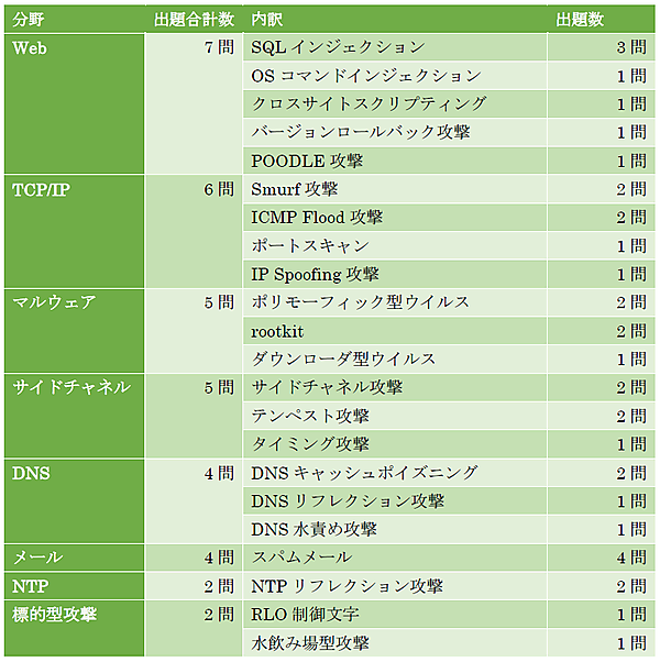 まず、攻撃に関する問題が過去どの程度出題されているのかを見てみましょう。平成26年度春期から平成28年度秋期までの情報セキュリティスペシャリストの午前Ⅱ試験6回分で見ると、表のようになりました。
