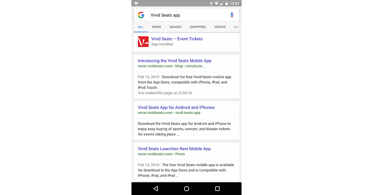 Vivid Seatsは2015年9月から、Androidアプリがインデックスされています。当初、Webページと関連付けたアプリのURIをGoogleの検索結果に見つけるのは困難でした。