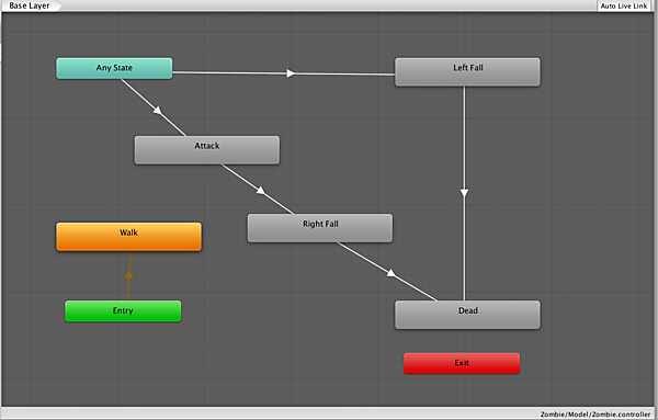 これで、スクリプトからプレイヤーへの攻撃時にはAttackトリガが、エネミー撃破時にはLeft Fallトリガが呼ばれ、それぞれのステートにトランジションするようになった。