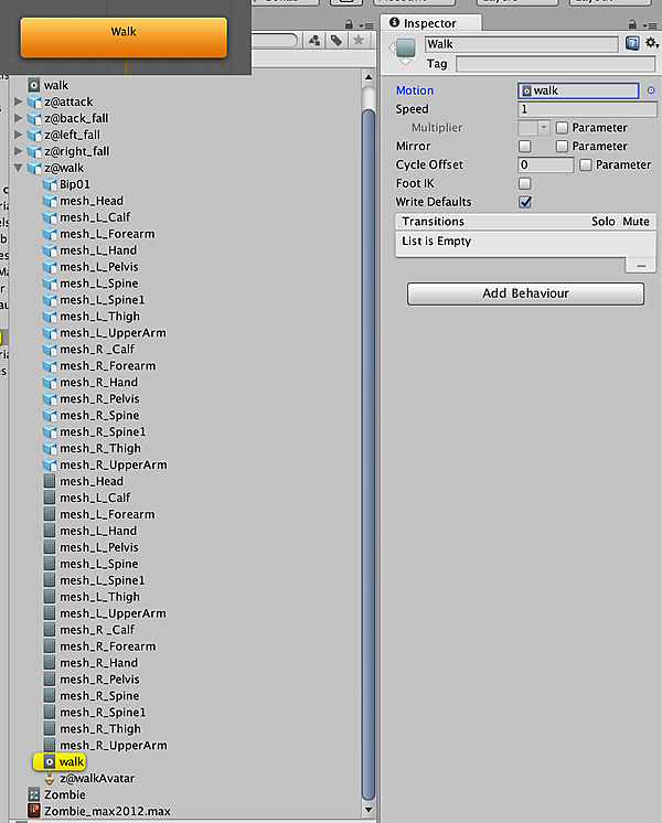 手始めにAnimatorウィンドウ上で右クリック > Create State > Emptyと操作して、新規ステートを作ってみよう。New Stateを選択するとインスペクタにステートが表示されるので、名前をWalkにしよう。続いて、Motionフィールドにプロジェクトビューのz@walkの下階層にあるwalkというオブジェクトをアサインしてみよう(図6)。これでWalkステートにwalkアニメーションが設定される。