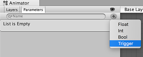 衝突検知時の分岐でSetTrigger()というメソッドがあるが、これはアニメーショントリガを呼ぶための処理である。アニメーショントリガはアニメーションコントローラで設定したトランジションを実行するためのパラメータで、スクリプトからステート遷移を行うために欠かせないものだ。つまり、スクリプトからSetTrigger("トリガ名")を実行することでトリガによってトランジションが開始され、アニメーションステートが遷移する。例えば、Walkステート中にスクリプトからAttackトリガが呼ばれるとステートがAttackに遷移し、Attackアニメーションが再生されるわけだ。
