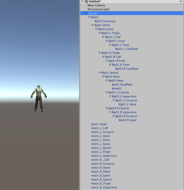 手始めに、Asset Storeから入手したこのゾンビのキャラクターの3Dモデルを動かしてみよう。新しいシーンを作成してAssets/Zombie/Modelz@walkを配置すると、キャラクターがシーンに表示されるはずだ(図3)。このゲームオブジェクトは、以前解説した基本的な3DデータであるFBXデータそのものである。